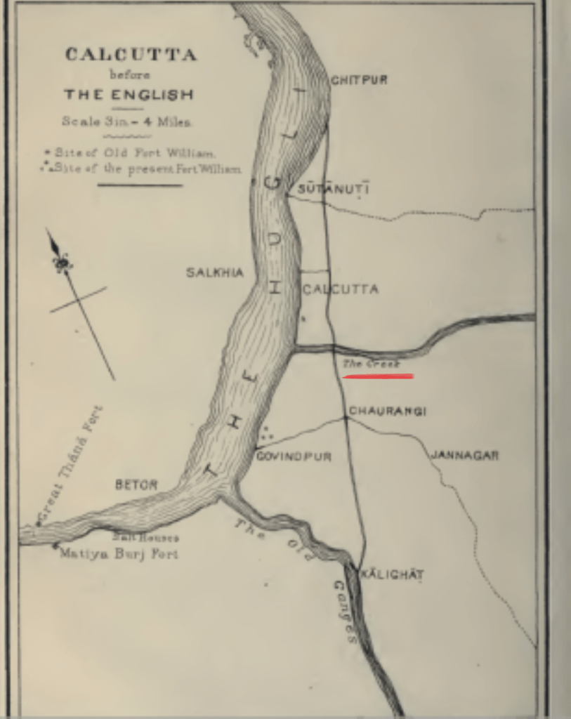 ক্রীক রো নামের মধ্যেই ডিঙা ভাঙা নামের ইতিহাস লুকিয়ে রয়েছে। আসলে প্রাচীন কলকাতার এই অঞ্চলটা দিয়ে বয়ে যেত একটা ছোট নদী বা ক্রীক। খাল নয়। হুগলী নদী থেকে বেরিয়ে পূব-মুখো এই ছোট শাখা নদীটি এঁকেবেঁকে চলে গিয়েছিল ধাপা হয়ে সুন্দরবনের দিকে। রীতিমতো নৌকো চলত এই পথে। নদীর চলতি নাম কি ছিল জানিনা, কিন্তু তখনকার ম্যাপে দেখা যাচ্ছে, একে “ক্রীক” বলেই চিহ্নিত করা হয়েছে।