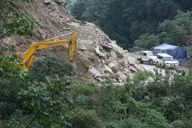 As our car slowed down on the narrow, hilly road and came to a halt behind a long line of other vehicles, we noticed the men and machines at work.  A huge earthmover was busy removing the stones and soil that had rolled down the hill and blocked the road.  It looked like we would be stuck for quite some time. So, we got off the car to look around.  The sky was slate grey, and the valley below was covered in a thick mist that was slowly rising.