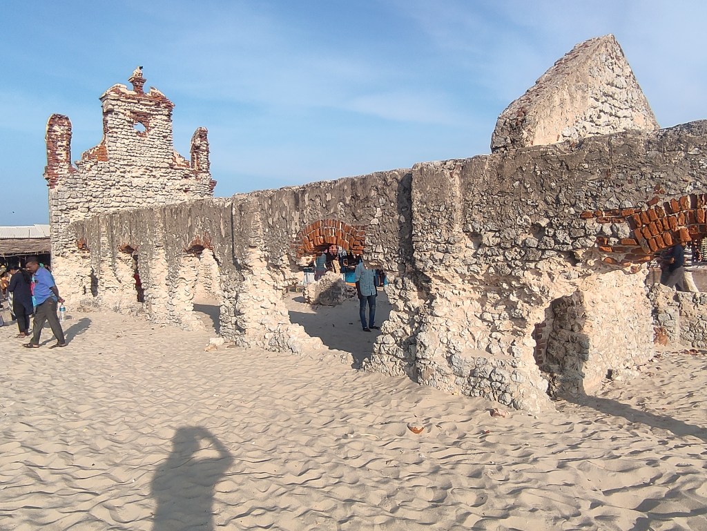 Before 1964 Dhanushkodi was like any other seaside town. A branch rail line from Pamban Junction ran up to Dhanushkodi station. A huge cyclone destroyed everything in Dhanushkodi. The railway lines, rail station and related infrastructure as well as all the houses were washed away by the tidal wave and the storm. The railway line up to Rameswaram was quickly rebuilt, along with the road bridge, but Dhanushkodi lies abandoned. A few brick walls of what looks like a church and skeletons of a few houses are all that remain at Dhanushkodi today. It turns into a ghost town after sunset when everyone must vacate the town.