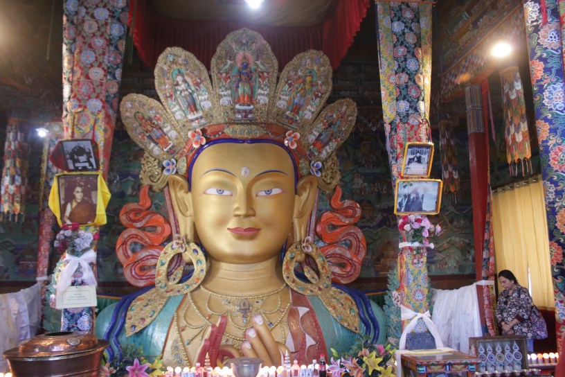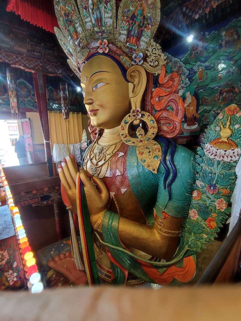 এবার দ্রষ্টব্য থিকসে গুম্ফা। বাইরে থেকে থিকসে গুম্ফা দেখতে অনেকটা লাসায় দালাই লামার পোটালা প্রাসাদের মতো । বেশ কয়েকটা সিঁড়ি ভেঙে উপরে উঠতে হয়। ভিতরে লম্বা উঠোনের একদিকে এখানকার প্রধান দ্রষ্টব্য মৈত্রেয় বুদ্ধের মন্দির। মন্দিরের মধ্যে প্রায় চল্লিশ ফুট উঁচু বুদ্ধদেবের মূর্তি। সাধারণতঃ এত বড় মূর্তি দাঁড়ানোই হয়। এই মূর্তিটি কিন্তু পদ্মাসনে বসা। মূর্তির শরীরের নীচের অংশ একতলায়, আর দর্শকরা দেখছে দোতলা থেকে তার উপরের অংশ। কোনমতেই সম্পূর্ণ মূর্তিটিকে ক্যামেরায় ধরা সম্ভব নয়।
