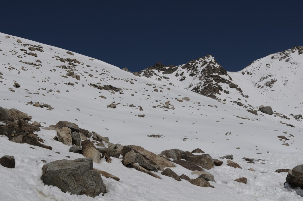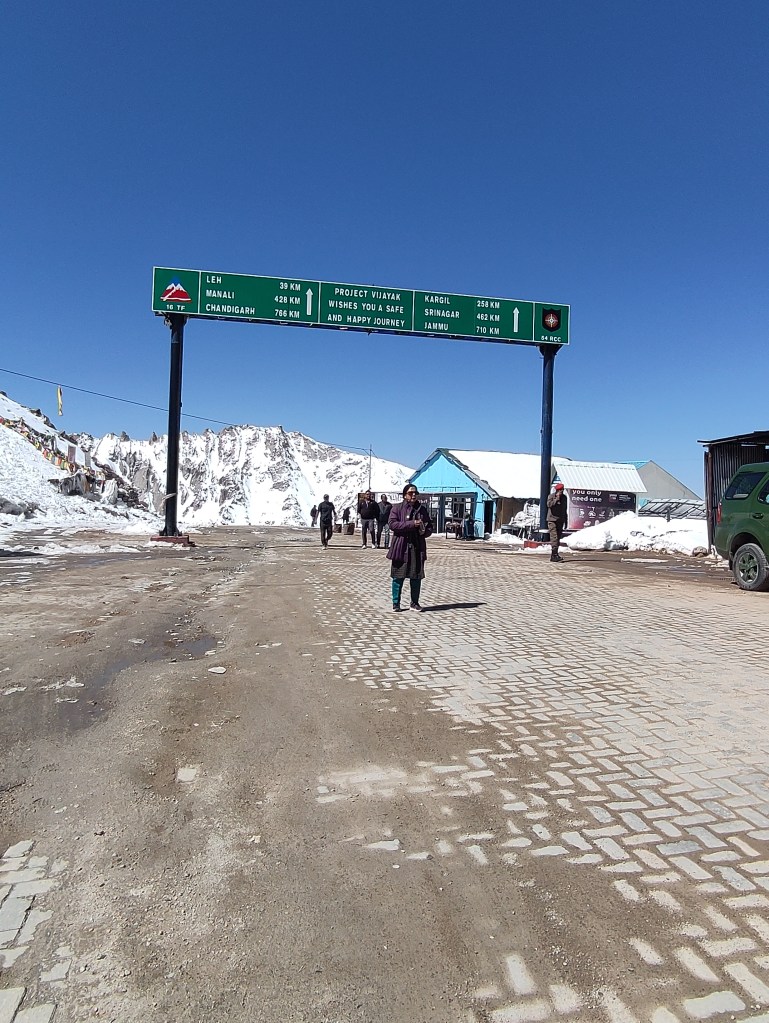 এই গিরিপথের দু’পাশের পাহাড়্গুলোর বরফে ঢাকা ঢাল রাস্তার এত কাছে এসে গেছে, এবং রাস্তায় বাঁকের জন্য মনে হয় যেন পথ এখানেই শেষ। সবাই ছবি তোলায় ব্যস্ত হয়ে পড়লেন। অনেকে পাহাড়ের ঢাল বেয়ে বরফের উপর দিয়ে হাঁটতে চাইছিলেন, কিন্ত ম্যানেজার অনুমতি দিলেন না কারণ এখানে কোনরকম হুড়োহুড়ি, লাফালাফি নিষিদ্ধ; তাতে ভয়ঙ্কর শরীর খারাপ হতে পারে। উনি বললেন খারদুং-লা থেকে কিছুটা নিচে পথের ধারেই যথেষ্ট বরফ পাওয়া যাবে। সেখানে আমাদের যথেষ্ট সময় দেওয়া হবে বরফের উপর হাঁটা ও আনন্দ করার জন্য। ম্যানেজার কথা রেখেছিলেন।