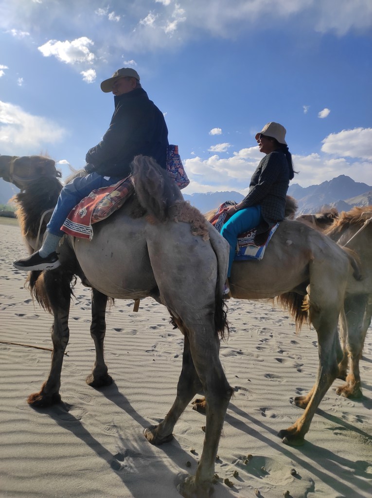 এই মরু প্রান্তরে দু’ কুঁজ ওয়ালা উটের পিঠে বেশ কিছুটা ঘোরা গেল। দুটো কুঁজের মাঝে বসার ব্যবস্থা – এক কুঁজের তুলনায় খারাপ নয়। কিন্তু আমাদের দলের একটা উট তার গা চুলকোবার জন্য আমার উটের পেটটা বেছে নেওয়ায় আমার জিন্সের ডান পা টা ছিঁড়ে যাওয়ার জোগাড়। আর আমার উটটা অন্য উটের গা রগড়ানি এড়াবার জন্য মাঝে মাঝেই ঝাঁকুনি দিয়ে উঠছিল। সে আর এক বিপদ। শেষে উট ওয়ালা অন্য উটটাকে পিছনে করে দেওয়ায় শান্তি।