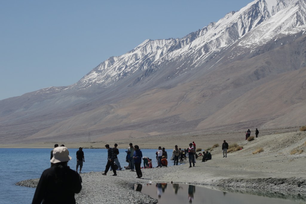 জল কনকনে ঠান্ডা, কিন্তু কেউ কেউ দেখলাম প্যান্ট গুটিয়ে সেই জলে নেমে পড়েছেন। চলেছে নানা ভাবে সেলফি তোলা। মাঝে মাঝে ভারতীয় সেনার মোটর বোট প্যাঙ্গং-এর নীল জলে সাদা ফেনা তুলে। চড়া রোদে গায়ে গরম জামা রাখা গেলনা। লেকের ধারে কোথাও কোন ছায়া নেই। কিছু ছোট ছোট চায়ের দোকান রয়েছে। মনে হল তারা লেকের ধারে ঘোরার জন্য স্কুটার ভাড়া দেয়। শুনলাম সূর্য ঢললেই শন শন করে রক্ত জমিয়ে দেওয়া ঠান্ডা হাওয়া দেয়। এখানে পর্যটকদের থাকার ভালই ব্যবস্থা রয়েছে ছোট ছোট স্বয়ংসম্পূর্ণ “টেন্টে”। এগুলো দেখলাম আসলে ঘরের মতোই এবং কিছু পর্যটক রয়েছেনও।